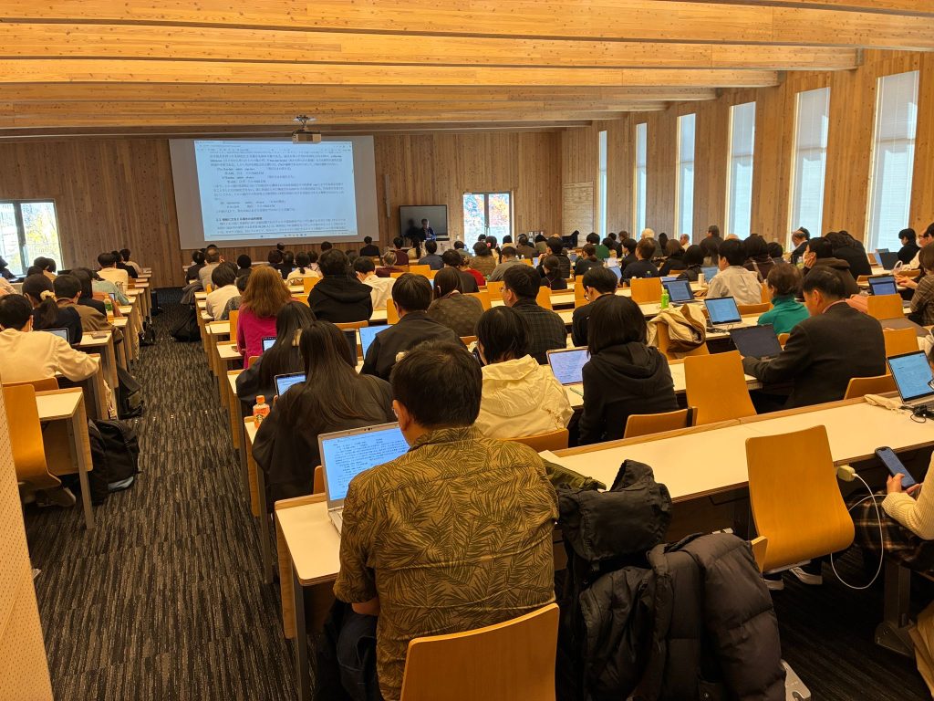 22日午後から一般教育棟 D・E 棟にて口頭発表・ポスター発表が行われ、夕刻より会員による参加者交流会が催されましたが、多数の参加者があり一部屋に入りきらず、二部屋に分かれて実施されました。23日午前は一般教育棟 D・E 棟でワークショップが行われ、23日午後からは、共育共創コモンズ(工学部)において、学会賞授賞式に引き続き、公開シンポジウムが行われました。公開シンポジウムのテーマは「アジアの諸言語の「ナル」と「ナル的」表現」で、13時より池上嘉彦 (東京大学名誉教授)の基調講演「事態把握とナル表現」の後、14時からは「チュルク諸語」「モンゴル諸語」「シンハラ語・ゾゾ語」「朝鮮語・アイヌ語」「日本語」について5名の講師がリレー講演を行い、その後、休憩を挟んで質疑応答が行われ、16時過ぎに閉会となりました。